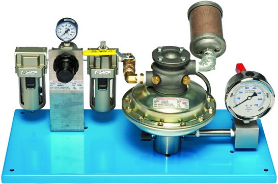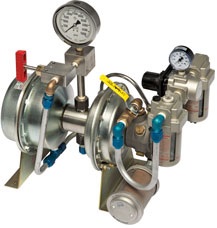 What You Get These ready-to-go power units come in a variety of configurations. They all include an S-216-J or P4 Series pump with an air prep unit (filter, lubricator, air pressure regulator) and a gauge, air shut-off valve and muffler. On the high pressure side they have a liquid outlet manifold, liquid pressure gauge and liquid bleed valve. (See the schematic below.) Some units also include a liquid inlet filter and/or a liquid reservoir with connecting lines. |
