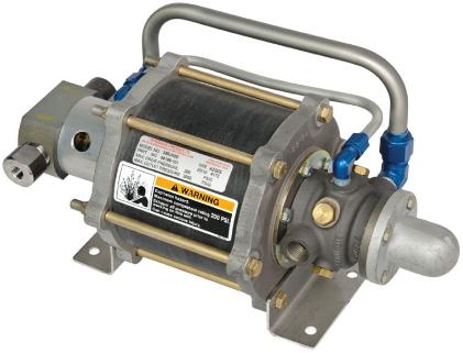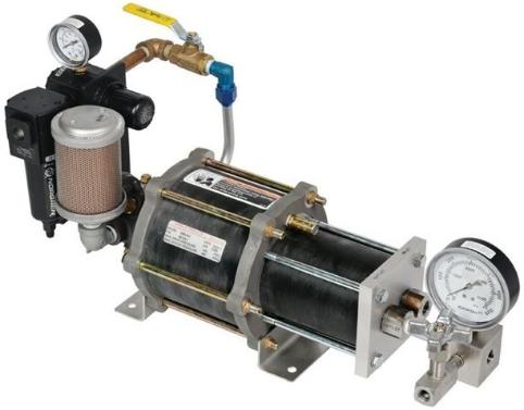 The Sprague gas booster is an air-operated piston-type booster. It uses a mechanically operated, snap-action air selector valve to cycle the booster. Low pressure air acting against a large area piston drives a small area compression piston which converts input gas to higher pressure. The discharge pressure developed is determined by the ratio between the area of the two pistons, the operating air pressure and the available pre-charge pressure. The function of the pre-charge pressure to the booster is to charge the high pressure cylinder inside the booster with gas, reducing the time required to reach higher pressures and the time to return the pistons for the next compression cycle. See the manuals (above) for more details.